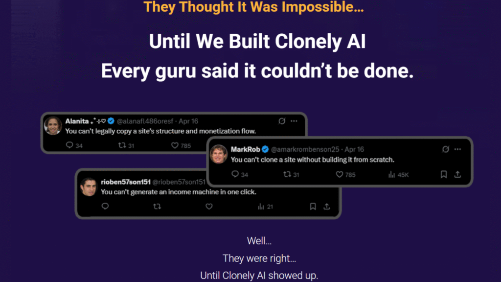 Clonely AI is a revolutionary website cloning tool that allows anyone — even total beginners — to legally replicate the layout, content, funnel, and monetization strategy of any successful website in just three clicks.