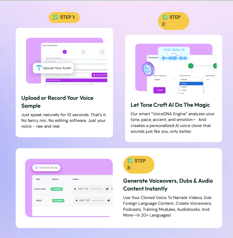 🎯 Tone Craft AI Works in Just 3 Simple Steps to Create Human-Like Voice Clones & Translations